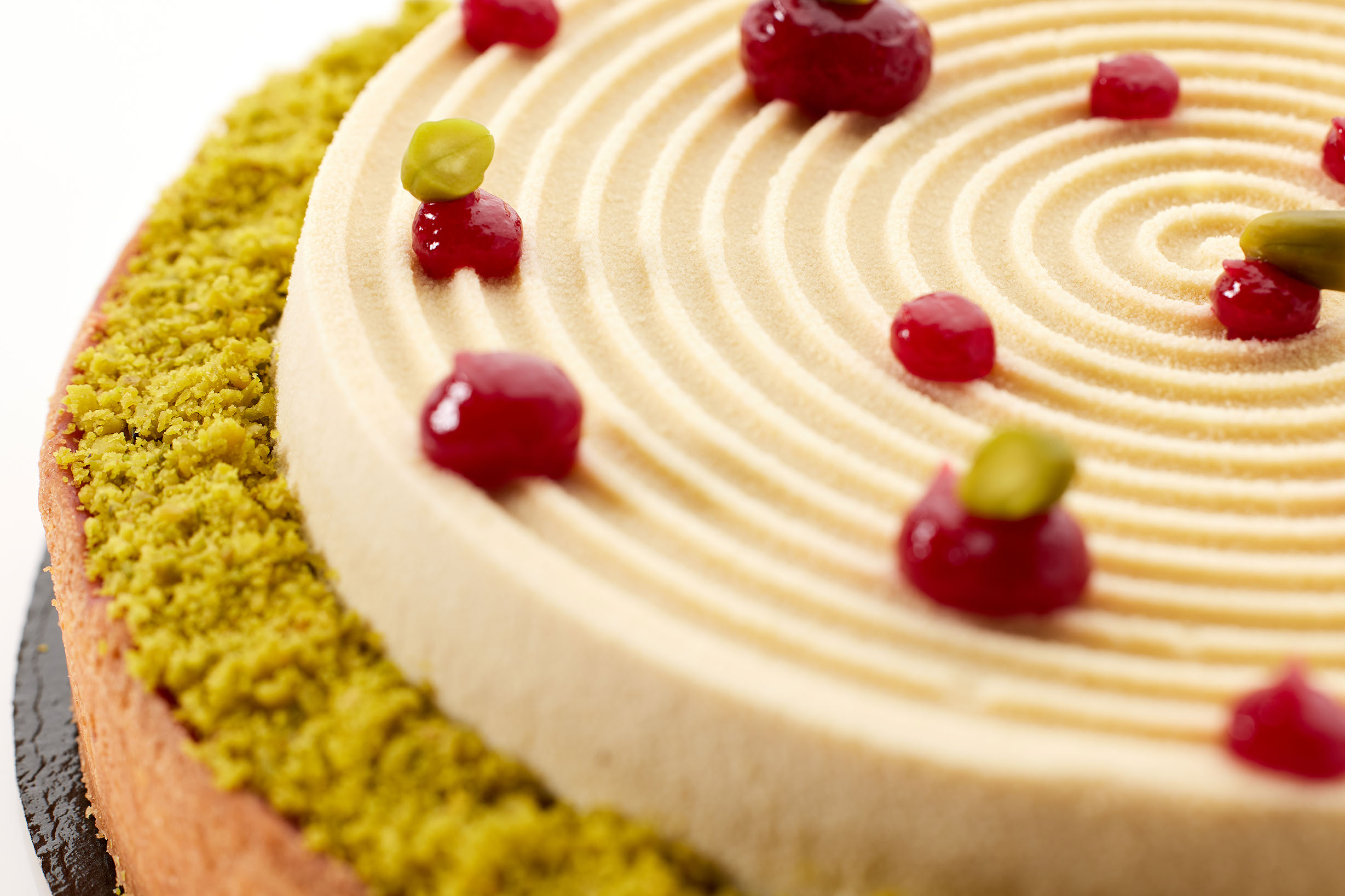 Deze taart combineert de zoetzure smaak van frambozen met pistachenoten uit Bronte. Zanddeegbodem met een laagje clafoutis onderin, frambooscrèmeux en pistachepoeder, afgeswerkt met een zijdezachte mousse van pistache.