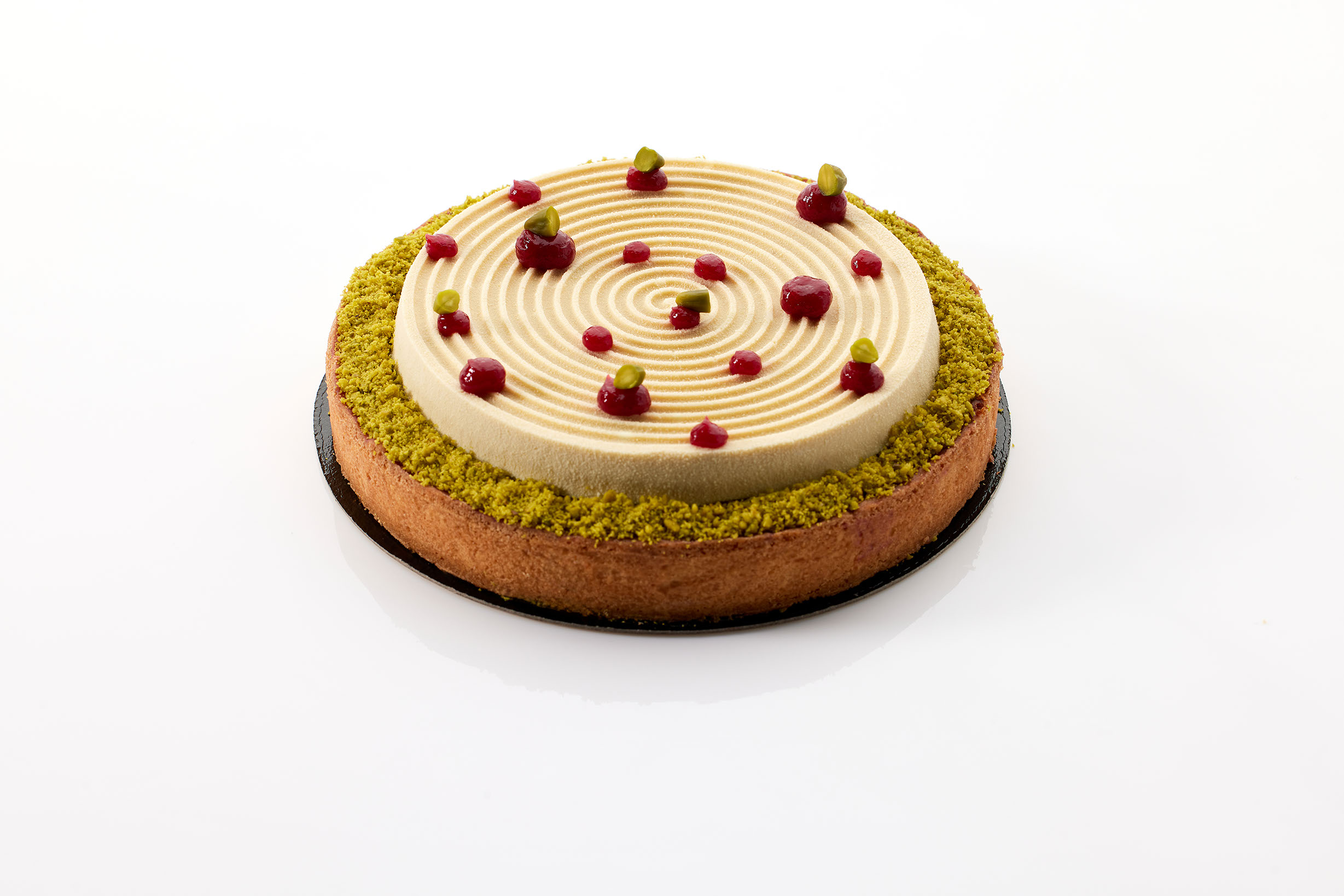 Deze taart combineert de zoetzure smaak van frambozen met pistachenoten uit Bronte. Zanddeegbodem met een laagje clafoutis onderin, frambooscrèmeux en pistachepoeder, afgeswerkt met een zijdezachte mousse van pistache.