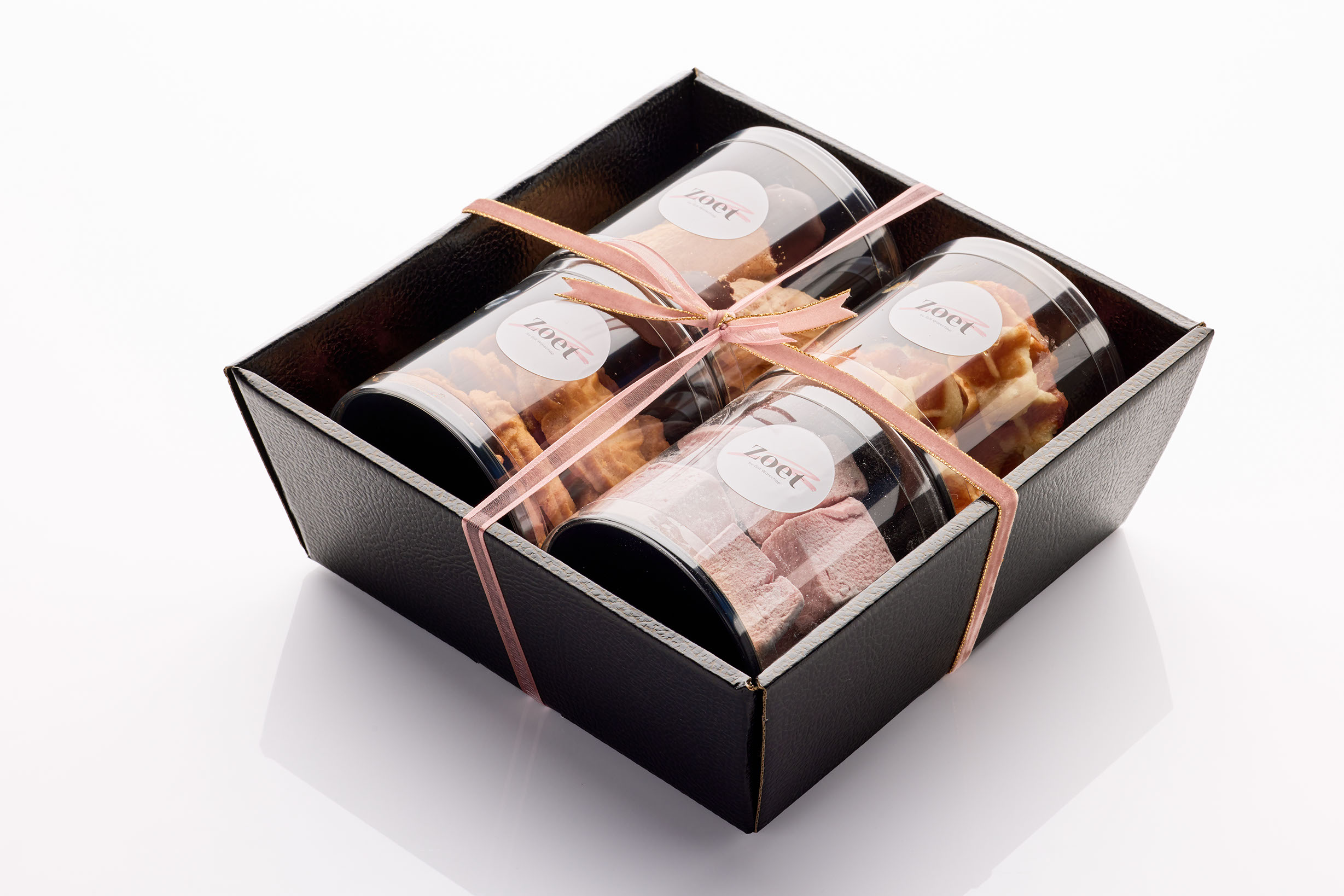 Dit cadeaupakket bestaat uit 4 verschillende potten zoetigheden: