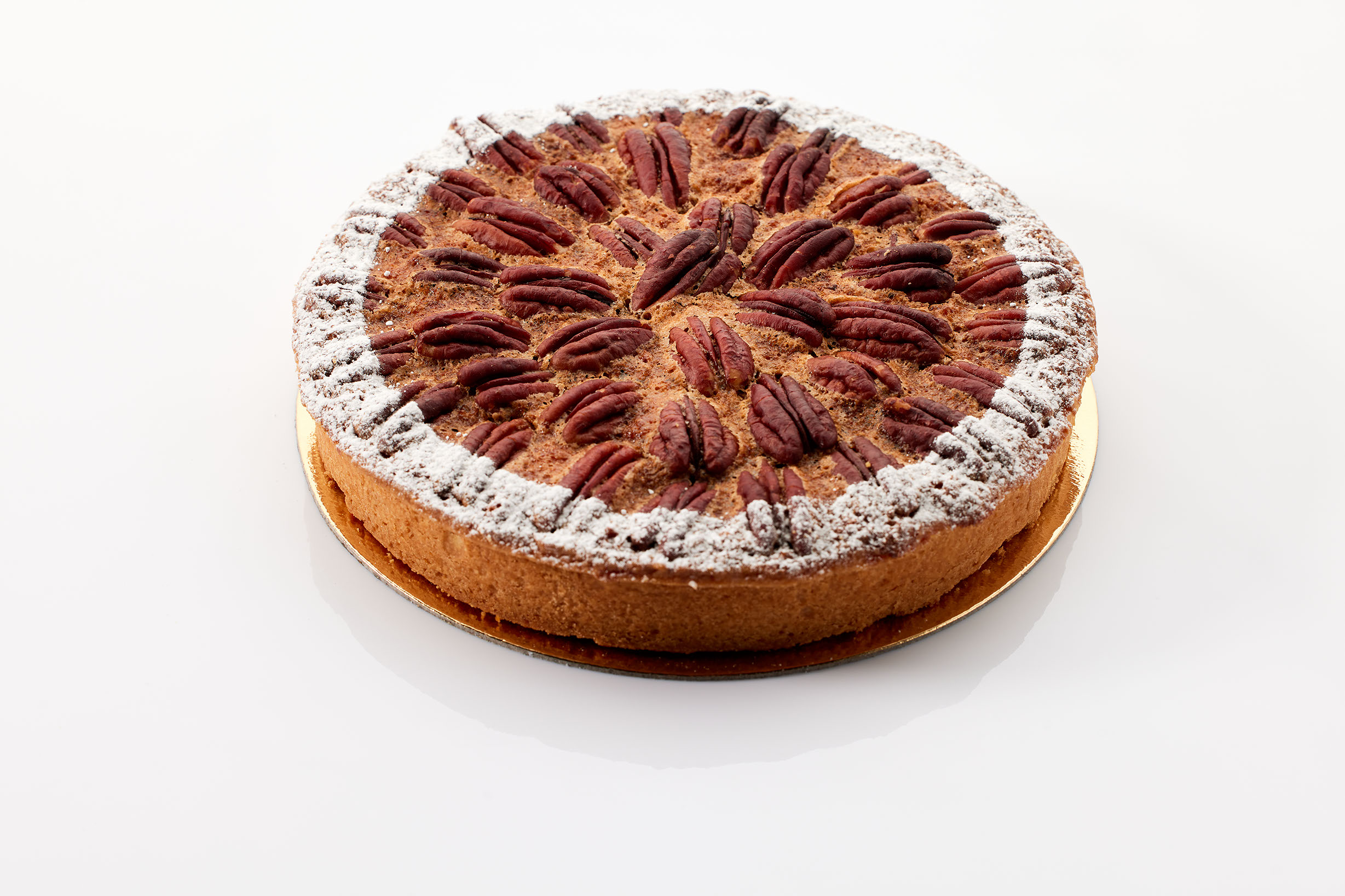 Hersft in een taart! Heerlijk gebak op basis van zanddeeg en honingvulling boordevol pecannoten. Verkrijgbaar in individuele portie of taart voor 5 personen.